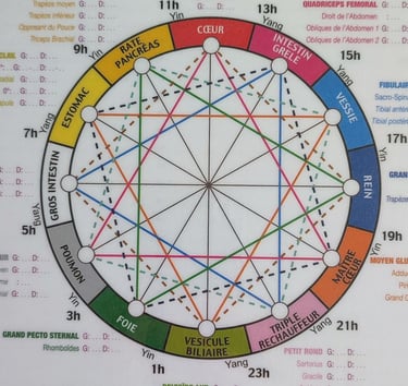 À l’aide du test musculaire, je vais identifier à quel niveau sur les 14 méridiens se trouve le déséquilibre (vide ou excès d’énergie) et j’utiliserai ensuite plusieurs techniques (massages de points réflexes neuro-lymphatiques ou neuro-vasculaires, liberation de stress émotionnel,acupressure , rotations occulaires ,etc.) pour que l’énergie circule de manière équilibrée sur l’ensemble des méridiens et que votre corps valide l'objectif.